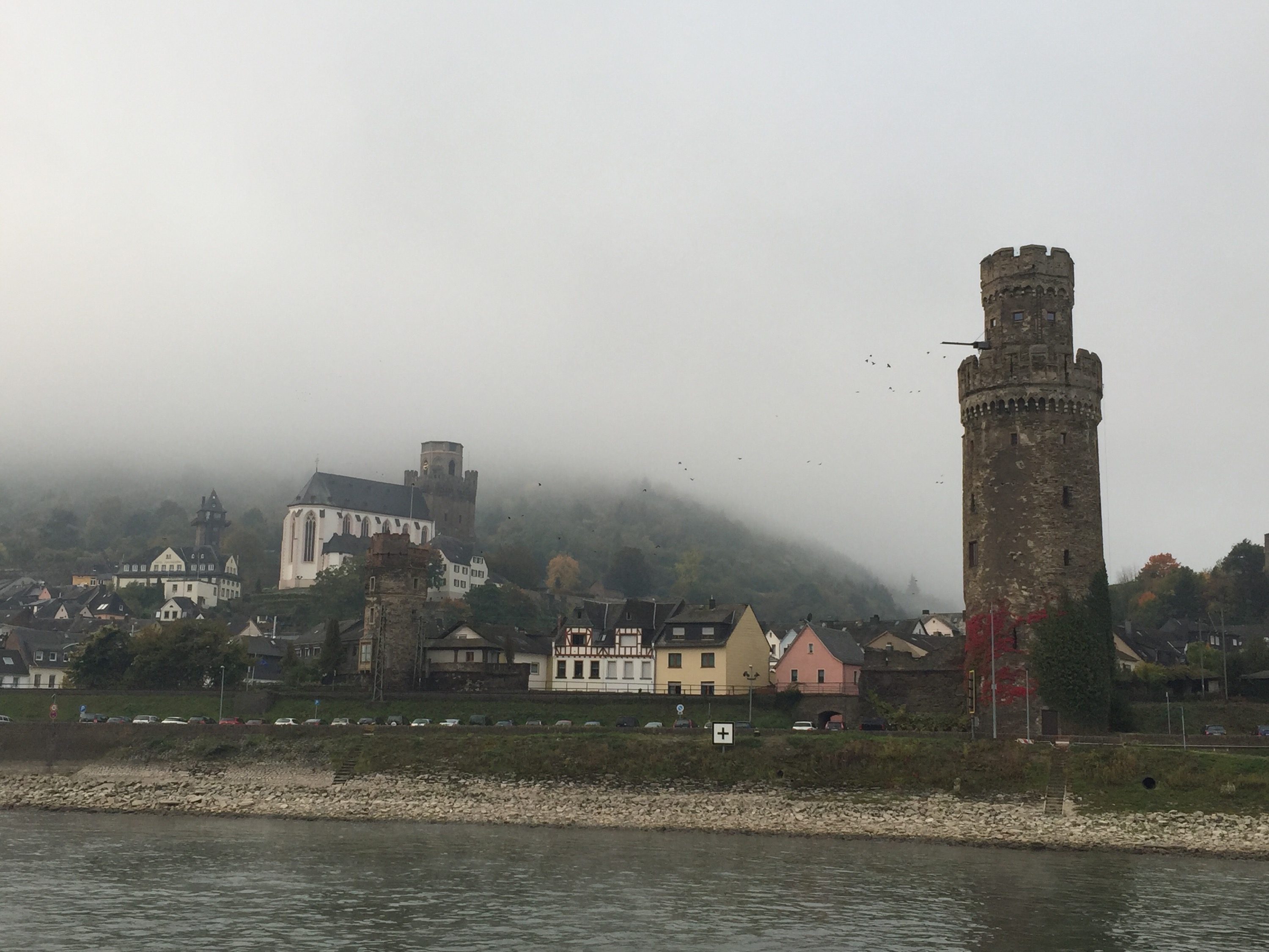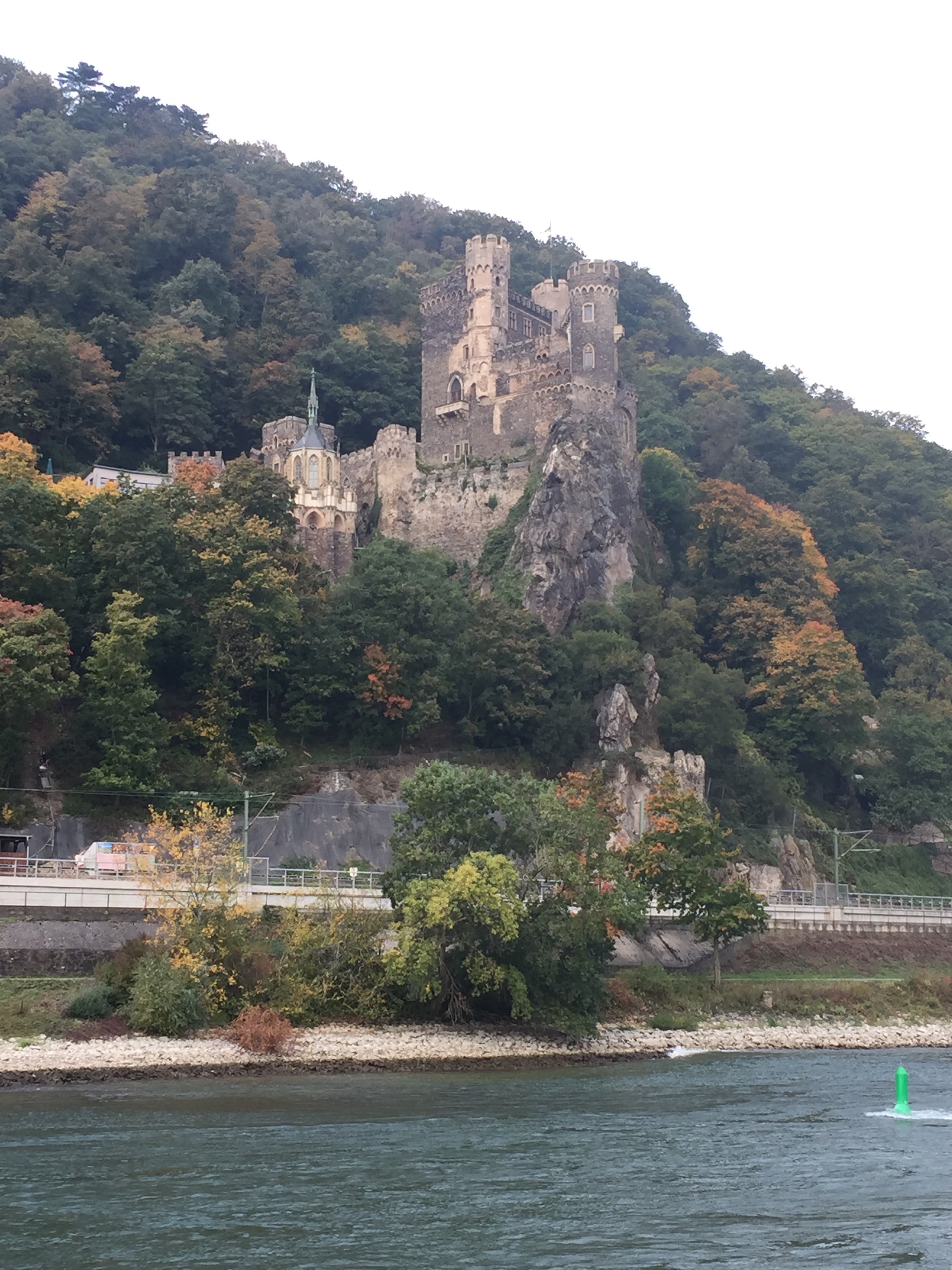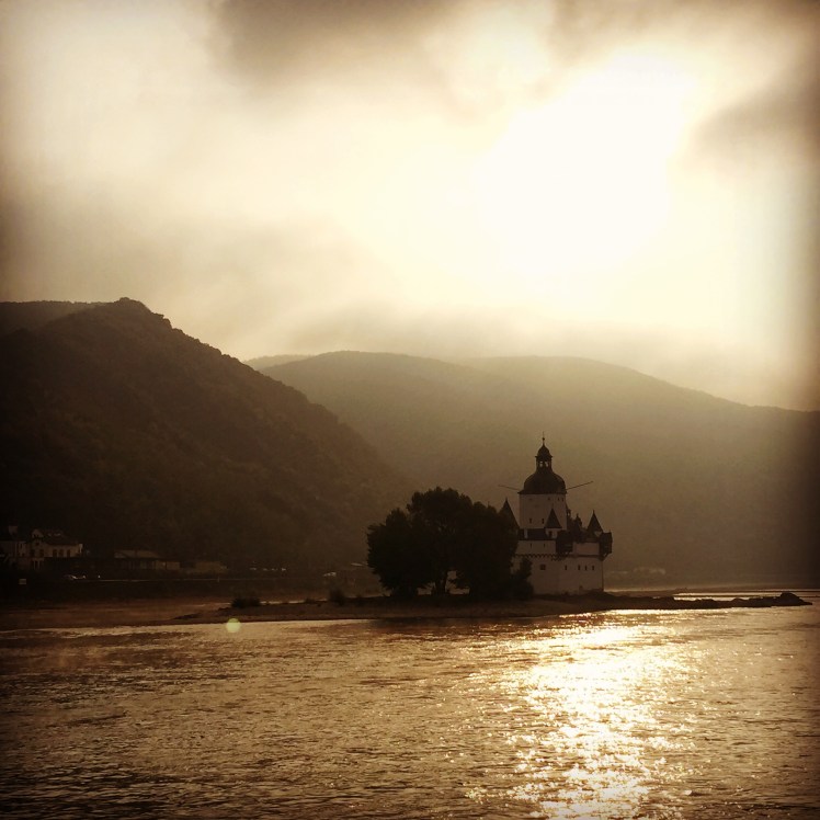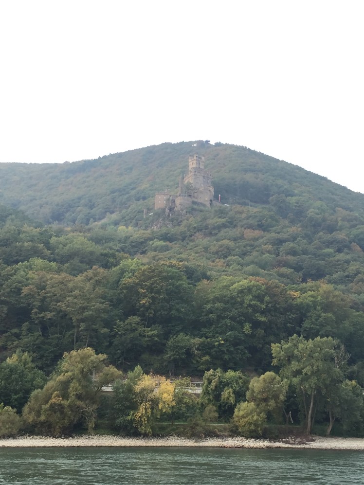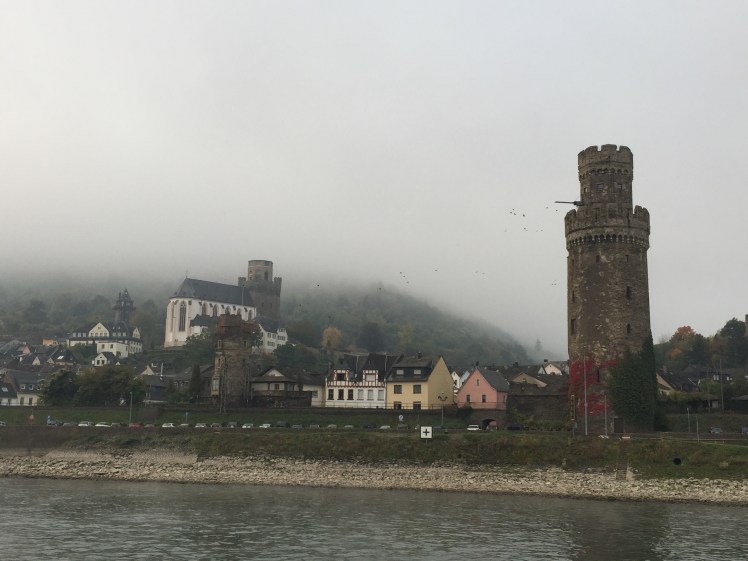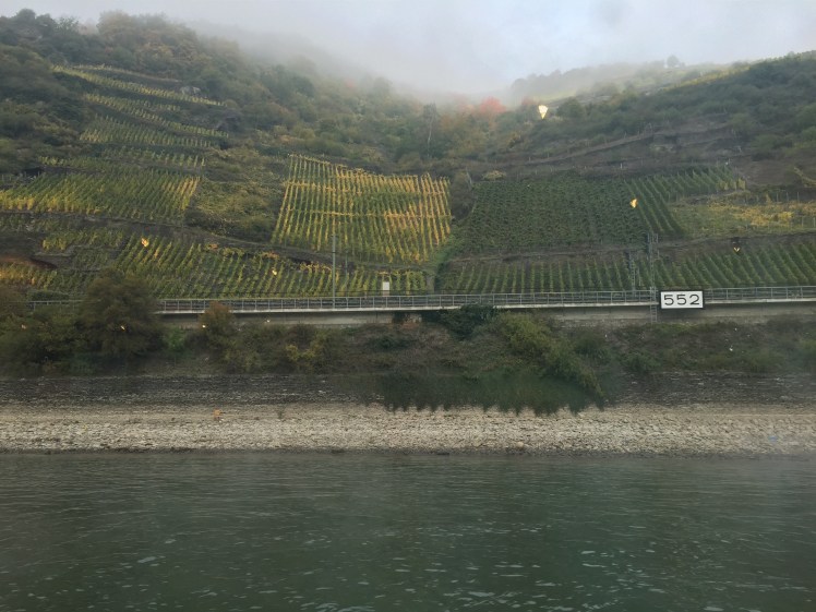 Loreley is a 433 feet high slate cliff towering above the narrowest part of the Rhine near St. Goarshausen. It became famous for the tale of Loreley, a beautiful but melancholy siren who would sit on the rock and sing as she combed her golden hair. Her beauty and mesmerizing song distracted sailors from the strong currents and their ships smashed to pieces against the rocks. As we sailed past Loreley, we listened to Ella Fitzgerald sing her rendition of the George and Ira Gershwin classic, Lorelei. We continued to sail down the Rhine and the foggy morning turned into a beautiful, chilly morning.