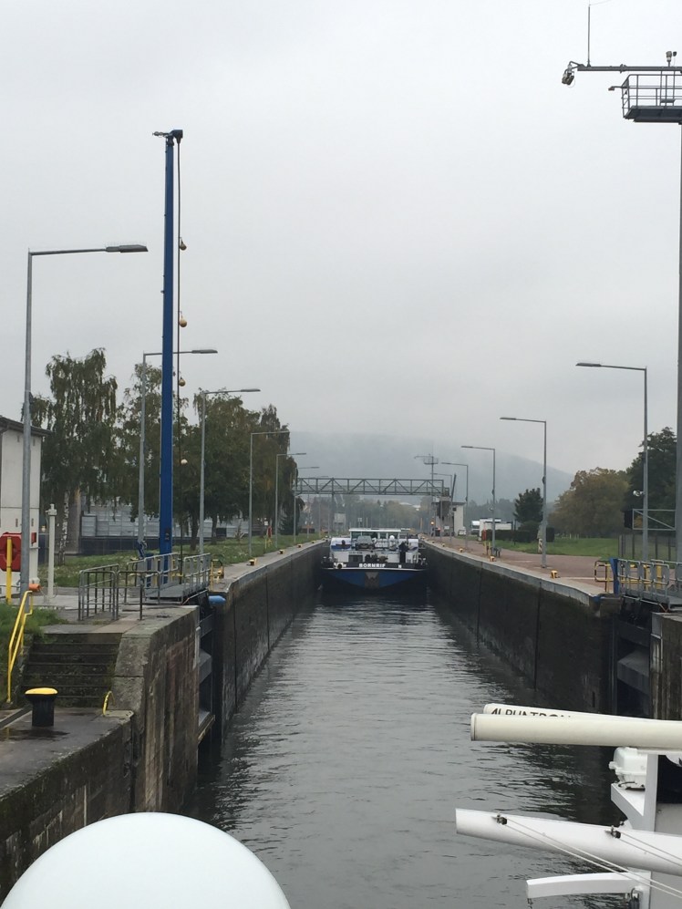Late in the afternoon, I checked my credit card statement online, as I do every few days. I noticed a large charge from the Amstel Hotel in Amsterdam and couldn’t imagine what the charge was from. The hotel was to be paid for by Tauck and the only thing I charged to my room was the postage from a fairly small package that I shipped home that contained tour books, maps and a few items I had purchased along the first tour. I figured it would be easier to ship it home than to carry it all with me for the next month. Let’s just say that I won’t be doing that again! It cost me an arm and a leg and I was the topic of conversation at the dinner table. It was humorous to the other staff that I made such a rookie mistake and I laughed a long for a while….but after a while, it got to me and I excused myself from the dinner table. Two lessons learned: 1. Don’t ship packages home. It is cheaper to pay for a second suitcase. 2. If you make a rookie mistake, you won’t forget it. I called it an early night and for the first time since leaving home, I found myself a tad bit homesick. If you know me well, this won’t come as a surprise….I fell asleep before my head hit the pillow. I do love my sleep! I slept well until 4am when I was jolted awake by a rather large bump. Another lock….some captains navigate the locks better than others. This brings me to the locks along this itinerary. There are 68 locks along the Rhine, Main and Danube from Amsterdam to Budapest…..yes, 68!