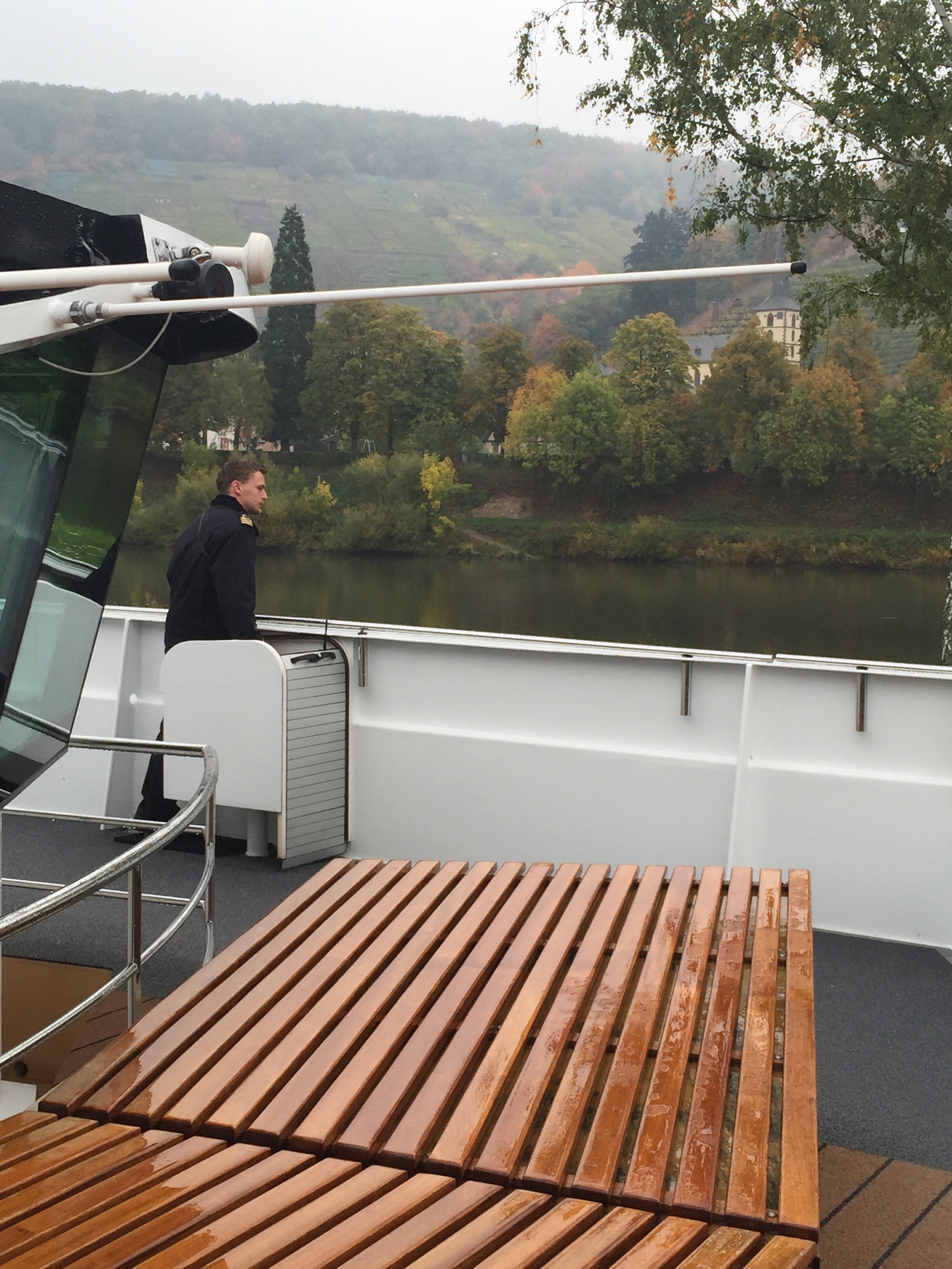 As I mentioned in a prior post, a lock is a place where boats that are traveling up or down a river or canal can be raised higher or lower. Locks are built in places where the level of water in the river or canal suddenly changes. The lock is like a big chamber with gates at each end and the lock gears fill or empty the fill chambers with water. Locks help a river to be more navigable or for canals to be built across land that is not level. The whole process of going through a lock may take 15-20 minutes, depending on river traffic….and we have 68 to go through! Wednesday was a sailing day along the Main River (Main is pronounced like “mine”)….a bit of a lazy day. It was cold and wet morning, with a 40% chance of snow, so everyone was content staying on board with a warm cup of Gluewhein. Gluewhein, also known as mulled wine, is made with red wine long with mulling spices and raisins. It is served warm, specifically during the winter season. I tasted the Gluewhein and it was not my thing…I cozied up in the lounge with a warm cup of hot chocolate. The morning was filled with wheelhouse commentary from Kati…boatloads (no pun intended) of information and facts about the history, towns and scenery along the Main River. Guests can listen to wheelhouse commentary in the main lounge, on the sun deck or in their cabin (the volume can be turned off in the cabin if they do not want the commentary piped into their personal space). There was quite a bit of river traffic, specifically as we approached various locks. Late morning, Anke gave a lecture entitled “Dutch Liberalism.” Towards the end of lunch, we crossed paths with the MS Treasures and there was a scheduled captain swap. We docked just before one of the locks and the MS Treasures literally pulled up right beside us and one of our captains jumped onto their ship and visa versa. And apparently, the other ship was low on a certain beer and we were low on tomatoes….so those were swapped as well.
