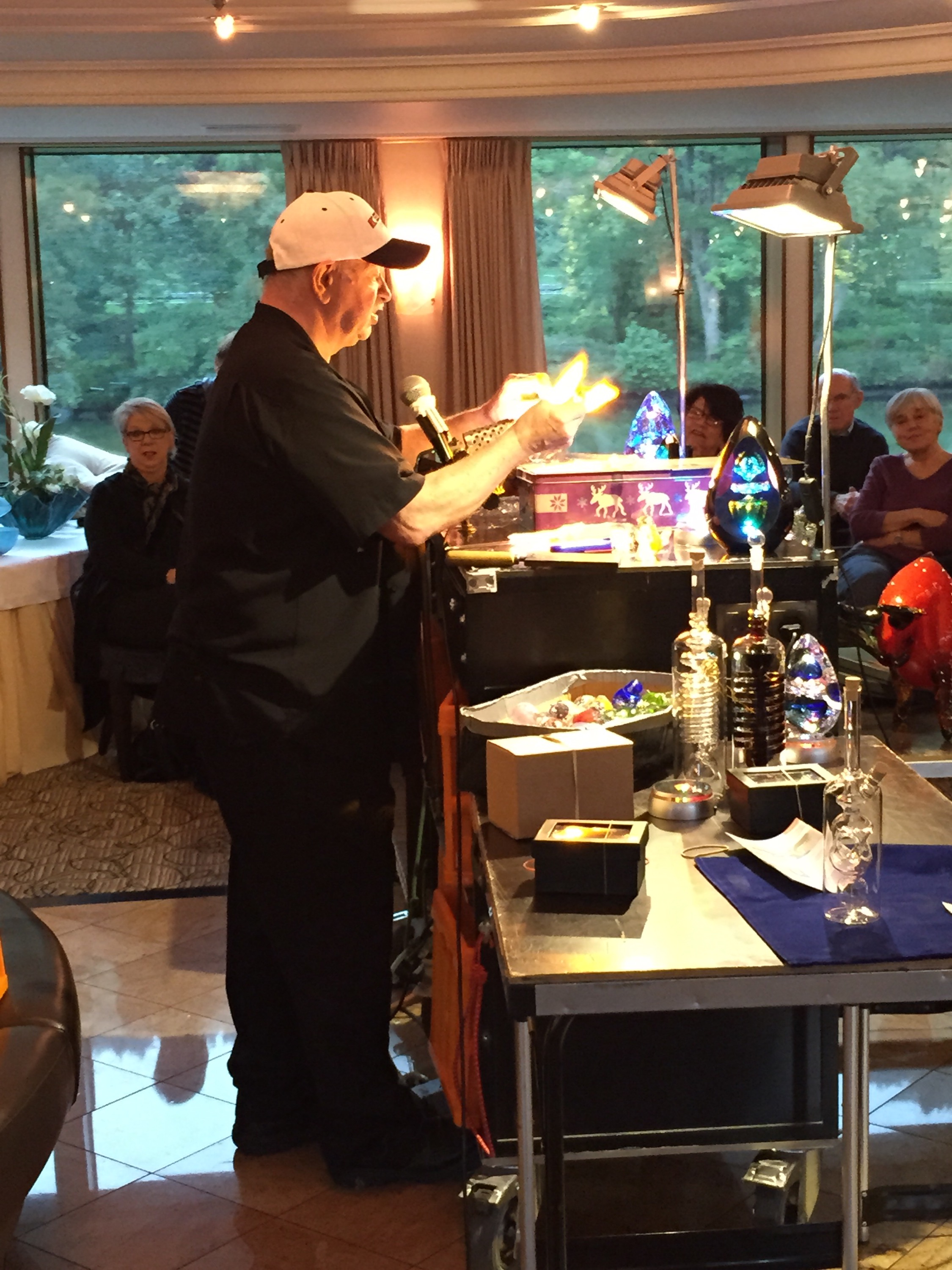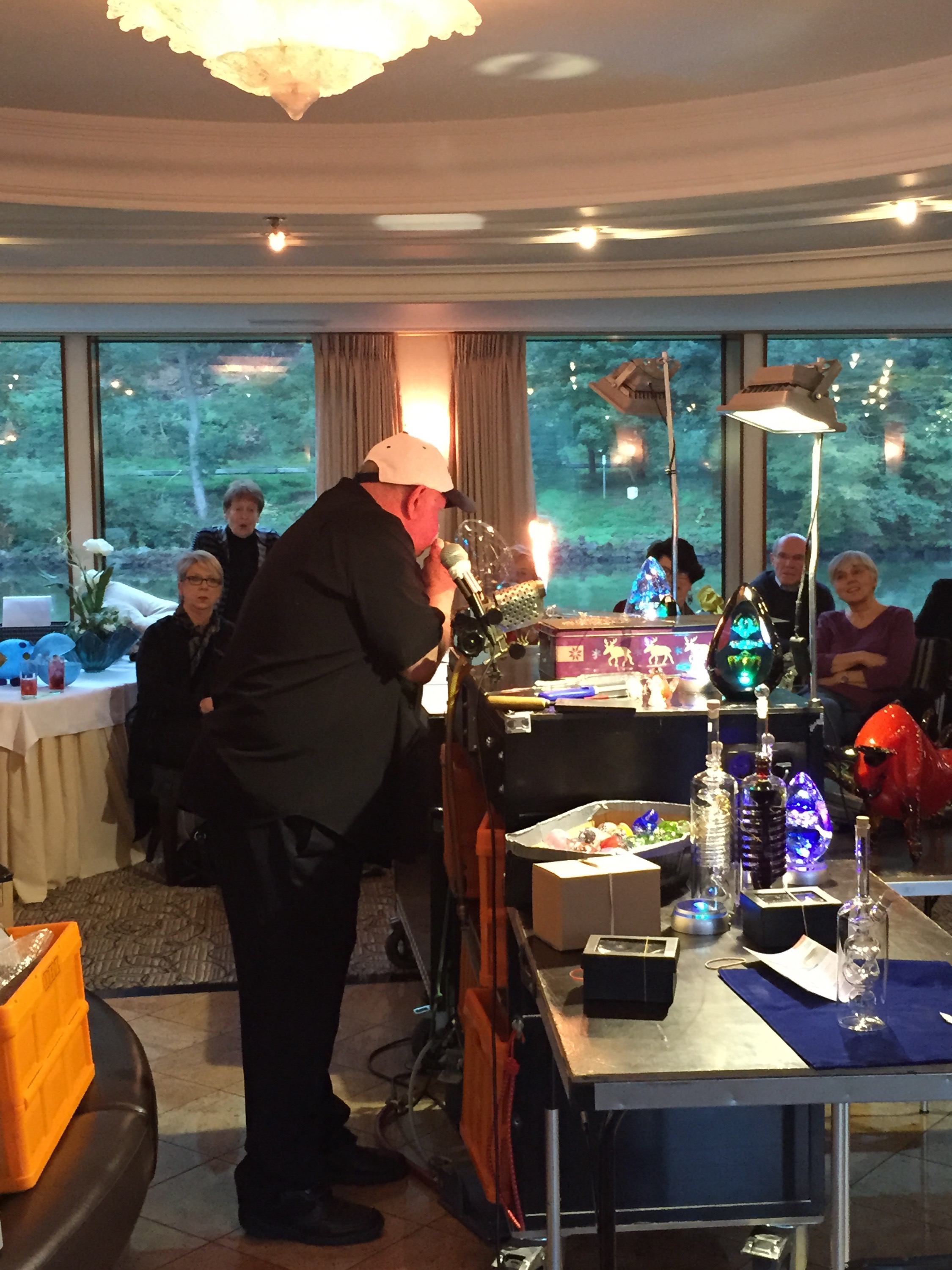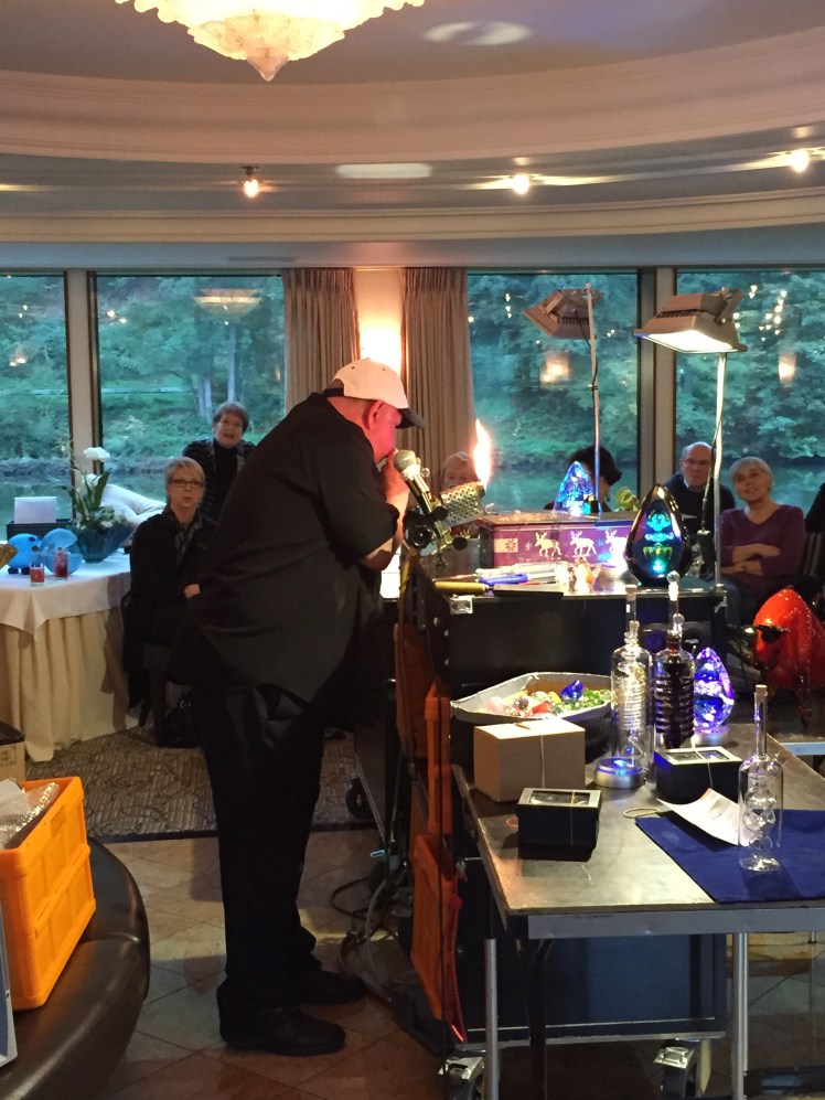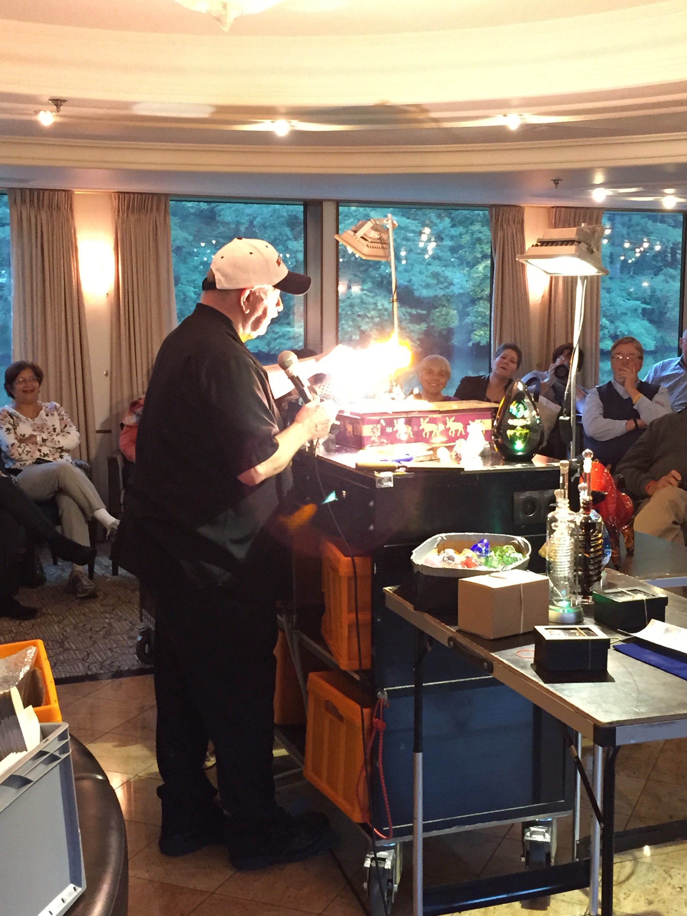 The staff of the two ships were excited to see each other and the entire exchange was quite humorous. The staff said that in all the years they had been doing this job, it was the first time they had seen that happen. After lunch, everyone enjoyed a lazy rainy afternoon. Around 4pm, we went through another lock (imagine that!) and a famous glass-blower hopped/rolled onto the ship with all of his gear for a glass-blowing demonstration. Usually people can’t just hop on and hop off a ship at a lock….it’s good to know the lock masters! The glass-blower, Karl Heinz, is world renowned and has worked with Chihuly.